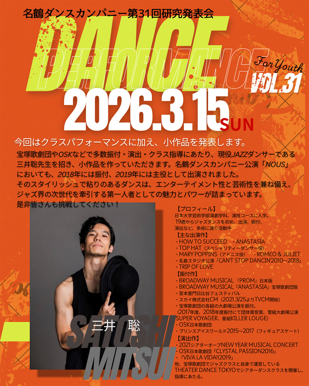 現在、宝塚歌劇団やOSKの演出・振付やミュージカル作品に出演でご活躍中の三井聡さんに作品を作っていただきます。
